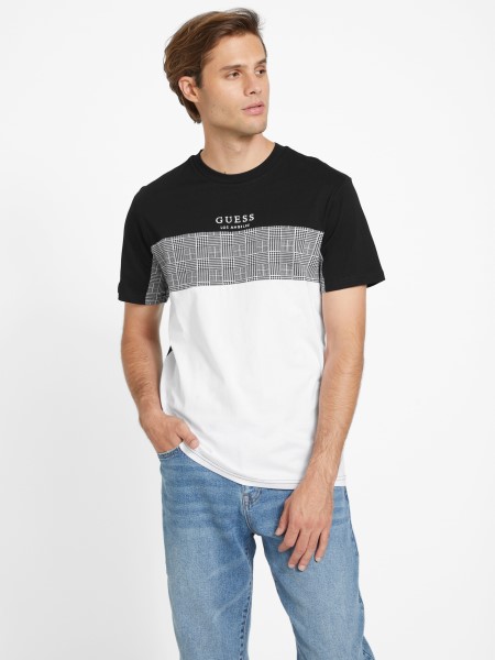 Az Ön Mindennapi, Csúszós Nyakú Pólója Darabos Kockás Csíkkal, Színes Blokk Dizájnnal, Klasszikus Logóval és Rövid Ujjakkal.