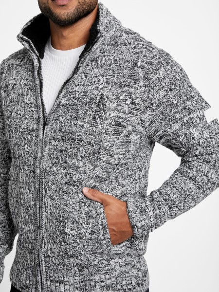 Márványos Dizájn Alkotja Ezt A Gyapjúkeverék Pulóvert, Amely Sherpa Béléssel Ellátott Nyakkivágással, Hosszú Ujjakkal, Elülső Zsebekkel, Bordás Díszítéssel és Cipzárral Rendelkezik.