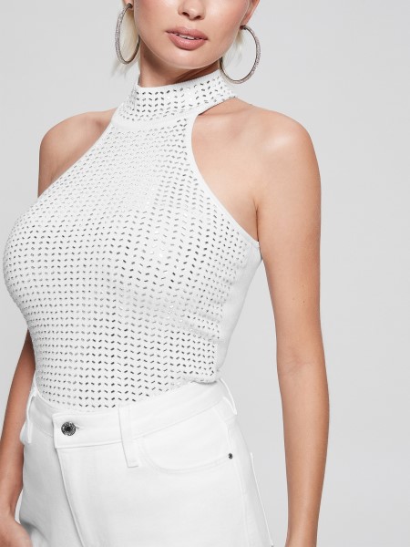 Ragyogj Egész éjszaka Ebben Az álnyakú Pulóverfelsőben, Amelynek Ujjatlan Sziluettje Van, és Elöl Tükrös Részletekkel Díszítették, Hogy A Középpontban Maradj.