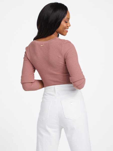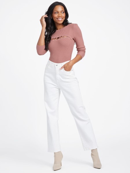 Mutasd Meg A Bőrt Ebben A Bordás Kötött Pulóverben, Amely Mellkason Fűzős Kialakítással, Szűk Nyakkivágással és Hosszú Ujjal Rendelkezik.
