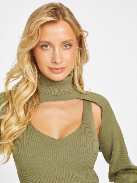 A Kettő Jobb, Mint Egy Ebben A Pulóverkombinációban, Amely Kötött V-nyakú Felsőrésszel és Külön Bolero-stílusú, Hosszú Ujjú Garbóval Rendelkezik. Felelősen Beszerzett Erdei Rost Felhasználásával Készült.