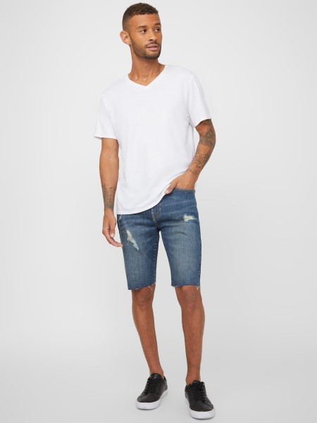 Térdig érő Farmer Rövidnadrág Fakulás és Enyhén Roncsolt Részletekkel A Nyugodt Megjelenés érdekében. Kopott Szegéllyel Fejezték Be.