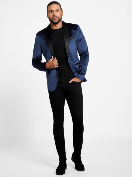 A Divatos Estékre Egy Bársony Blézer Szatén Hajtókával, Mellzsebbel, Hosszú Ujjú Gombos Mandzsettával és Dupla Gombos Zárással. Hátsó Szellőző.