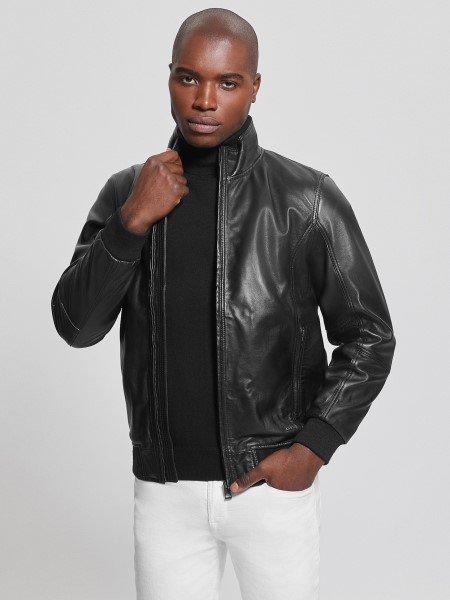 A luxe genuine-leather jacket with a soft feel features a mock neckline, long sleeves, front zip pockets and ribbed trim. Complete with interior pockets, a printed lining and zip-up closure.