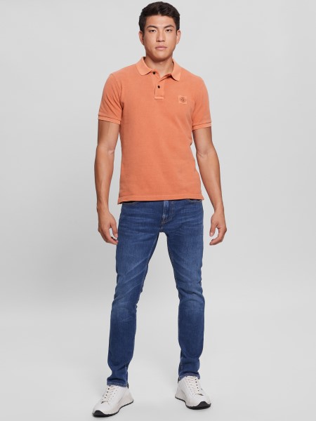 Workwear essential. Monochromatic pique polo made from a washed fabric features a folded collar, button placket, short sleeves and chest logo.