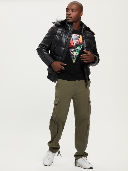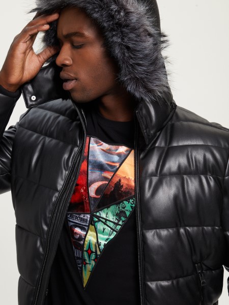 Complete your cold-weather look with this refined puffer jacket designed in a butter-soft, stretch faux-leather fabrication. Features a detachable hood with faux-fur trim, side slip pockets and front zip closure.