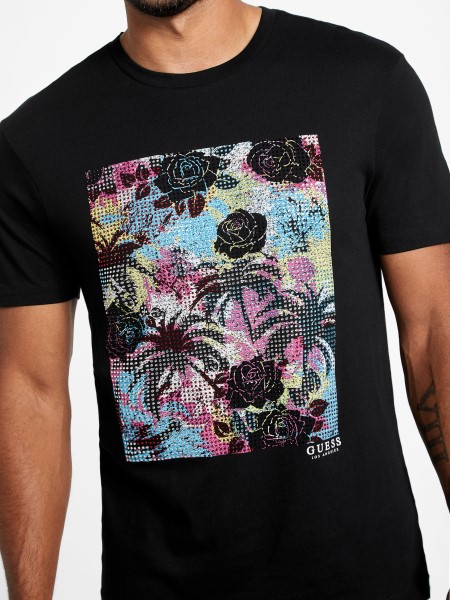 Élvezze A Retro Tengerparti Hangulatot Ezen A Színes, Virágos és Lombos Grafikával, Különböző Előtérben Lévő Pöttyökkel, Szűk Nyakkivágással és Rövid Ujjú Trikóval.