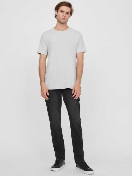 Egy Kényelmes Sztreccs Nadrág Hét Zsebes Kialakítással, Oldalsó Csomagtartó Zsebekkel, Cipzáras Mandzsettákkal, Finom Fakítással és Elülső Bajuszokkal.