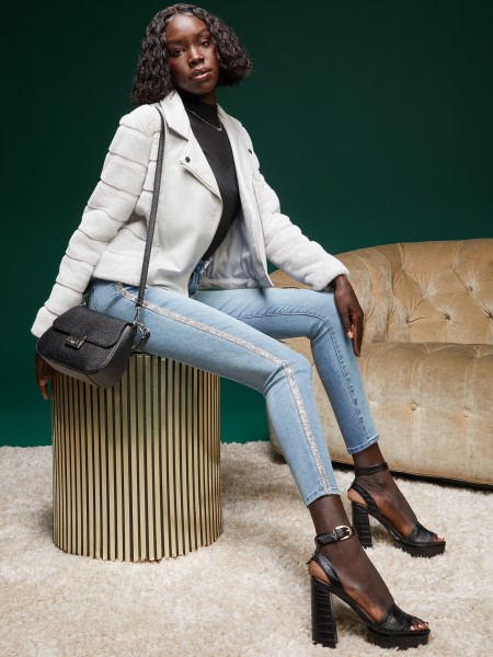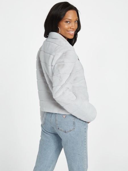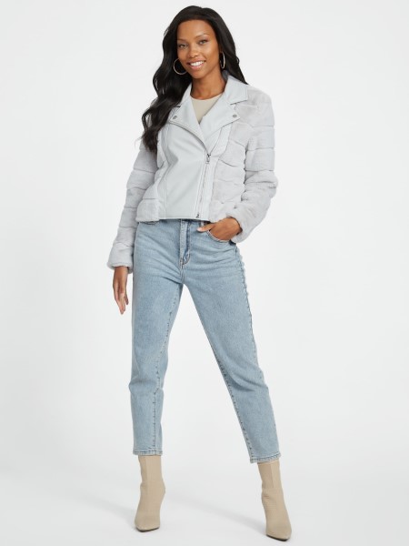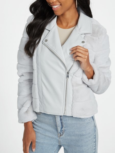 Ultrapuha Műszőrme Konstrukció Puhítja Ezt A Motoros Kabátot, Amely Kontrasztos Műbőr Előlappal, Klasszikus Rovátkolt, Hajtogatott Gallérral, Aszimmetrikus Cipzárral és Oldalsó Cipzáras Zsebekkel Rendelkezik.