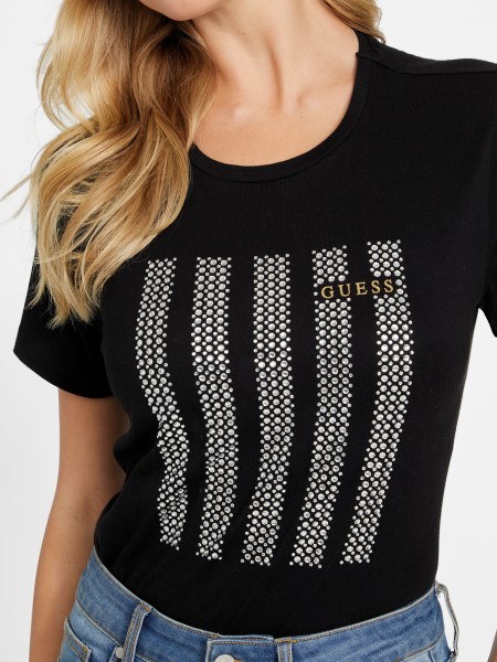 Tündököljön Mindennapi Megjelenésében Ezzel A Logós Pólóval. Elöl Strasszokkal Díszített Dizájnnal, Szűk Nyakkivágással és Rövid Ujjakkal. Szerves Pamutszálat Tartalmaz.