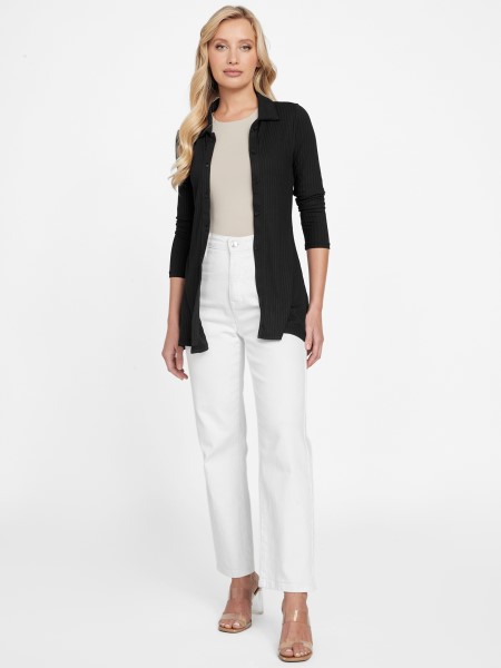 Ez Az újrahasznosított Műanyagot Tartalmazó, Elegáns Bordás Kötésű Anyagból Készült, Hosszú Ujjú Felső Hajtogatott Gallérral és Elülső Gombos Záródással Rendelkezik, Amelyek Félúton Megállnak, Hogy Egy Terített, Hosszú Zsinórú Sziluettet Kap.
