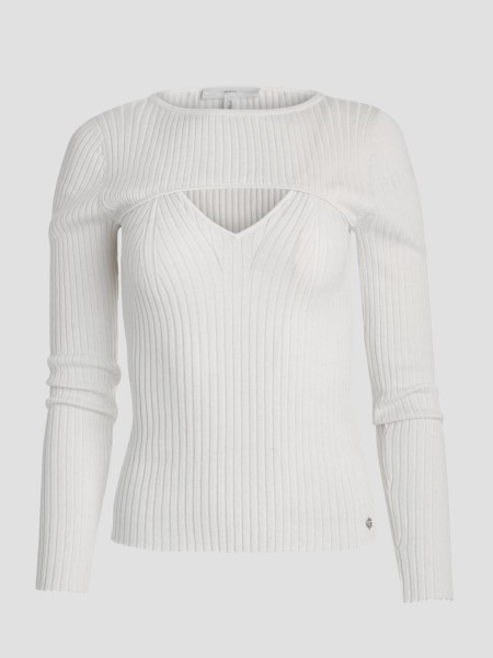 Guess Eco Marion Selyemkeverék Kivágott Pulóver Krém Fehér