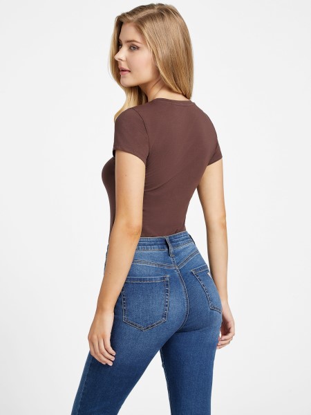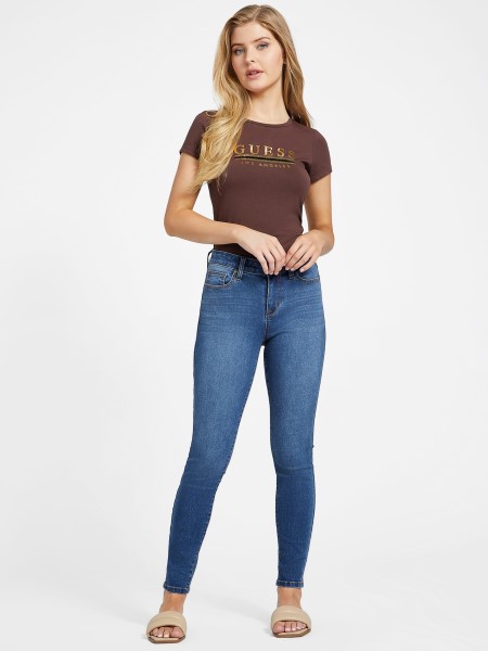 Stílusosan Képviselje Ezt A Rövid Ujjú, Nyakú Pólót, Amely Fémes Logóval és Flitterekkel Kiegészített Grafikai Dizájnnal Rendelkezik.