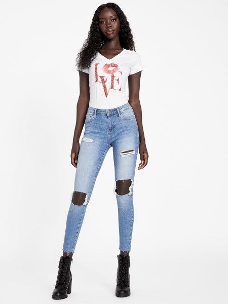 Beleszeret Ebbe A Rövid Ujjú Pólóba, Amelynek V-nyakkolása Ajakgrafikával és Szöveggel Rendelkezik, Amelyet Hegyikristály és Strassz Részletek Hangsúlyoznak. Bio Pamutszálat Használ.