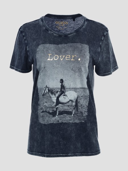 Könnyű Kivitelezésű, Rövid Ujjú Póló Nyakkendővel és Lovas Fotógrafikával, Rárakott Szöveggel.